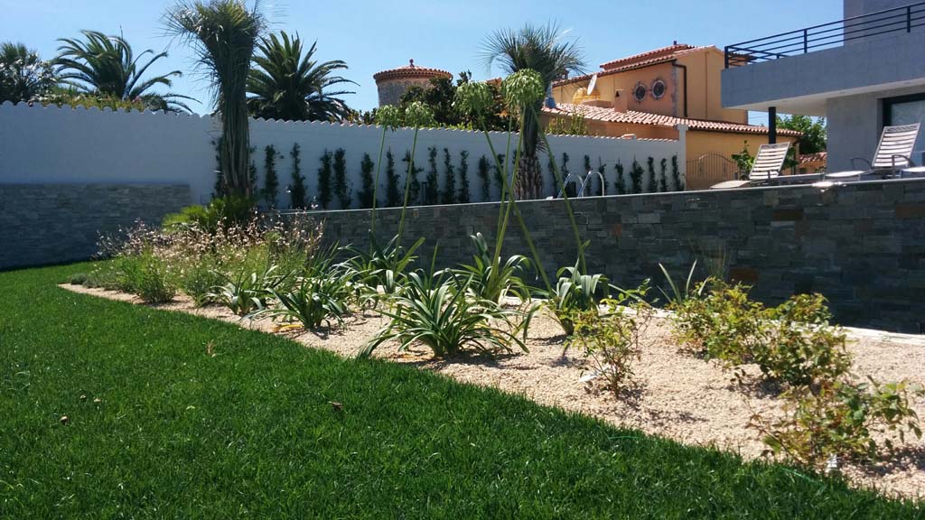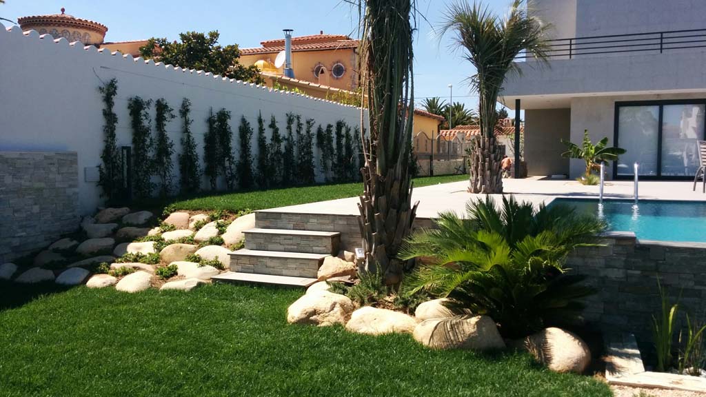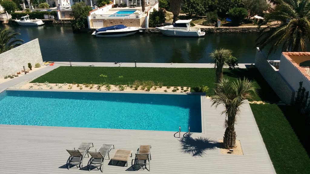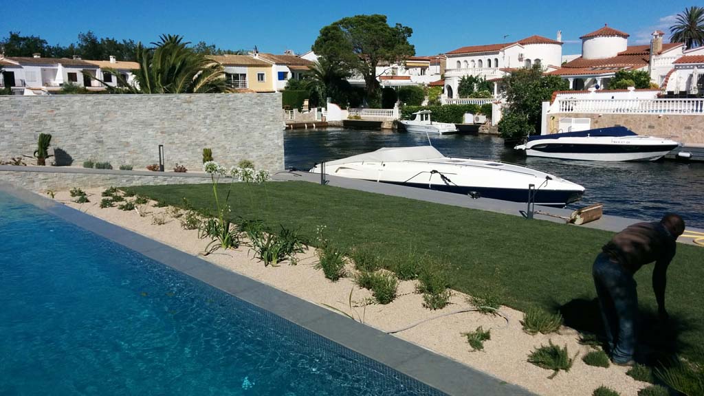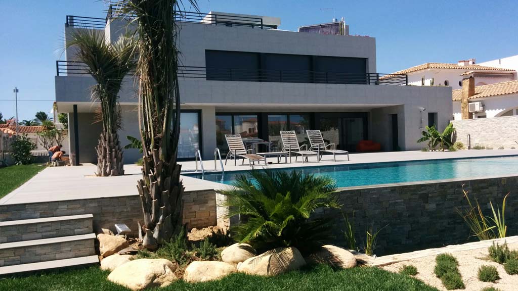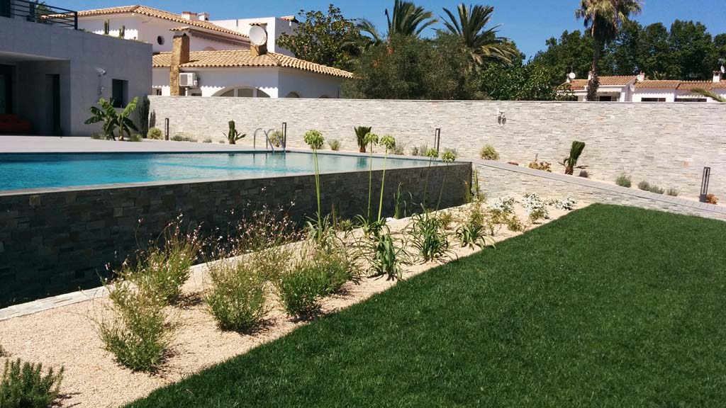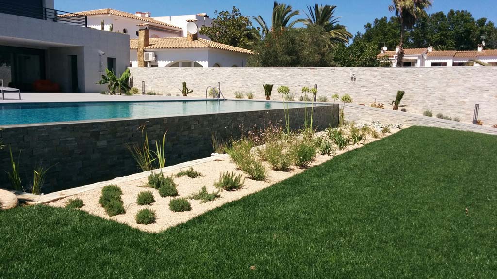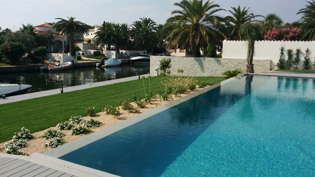 Jardí amb gespa natural en rotlles, palmeres per a destacar la piscina desbordant, on la senzillesa de les plantes i materials utilitzats donen al jardí l’elegància adequada a aquesta casa d’estil contenporani.