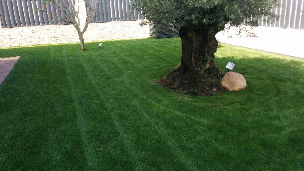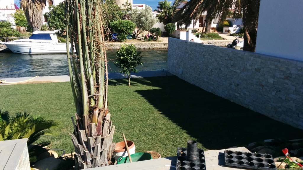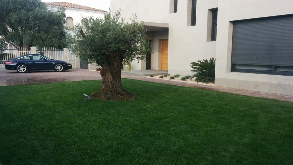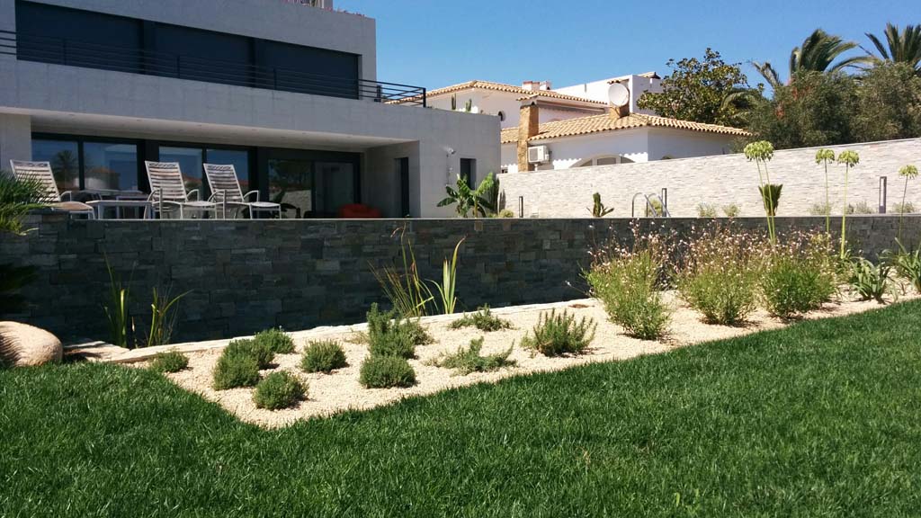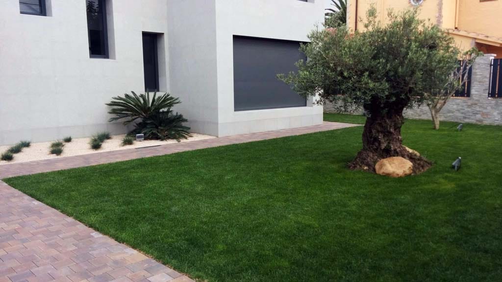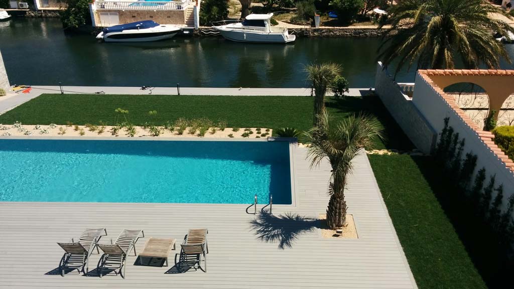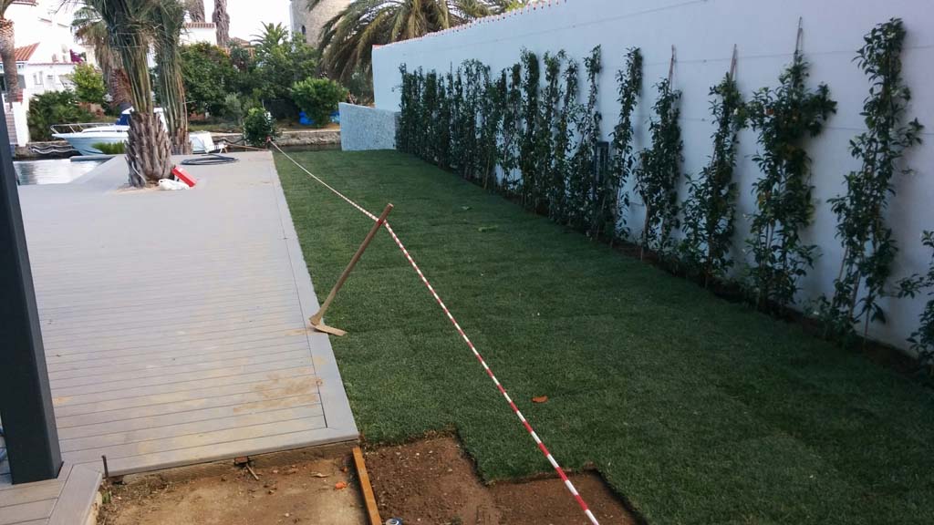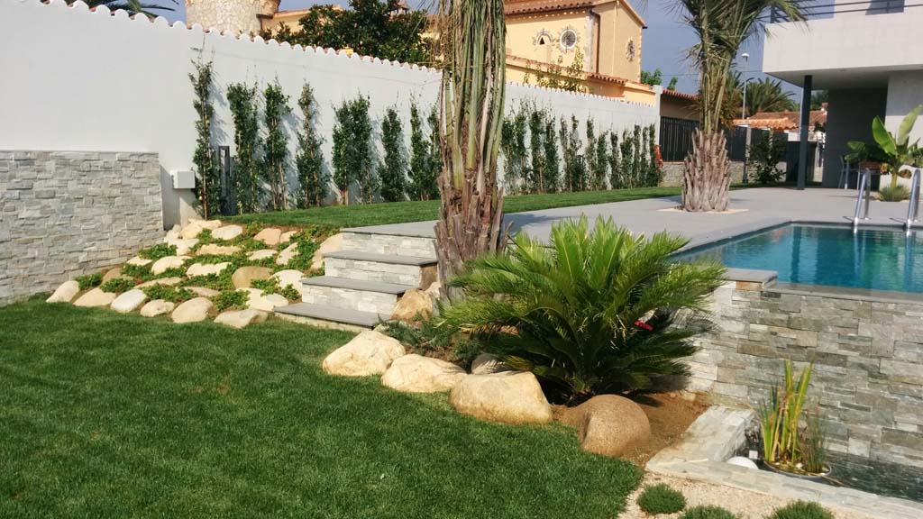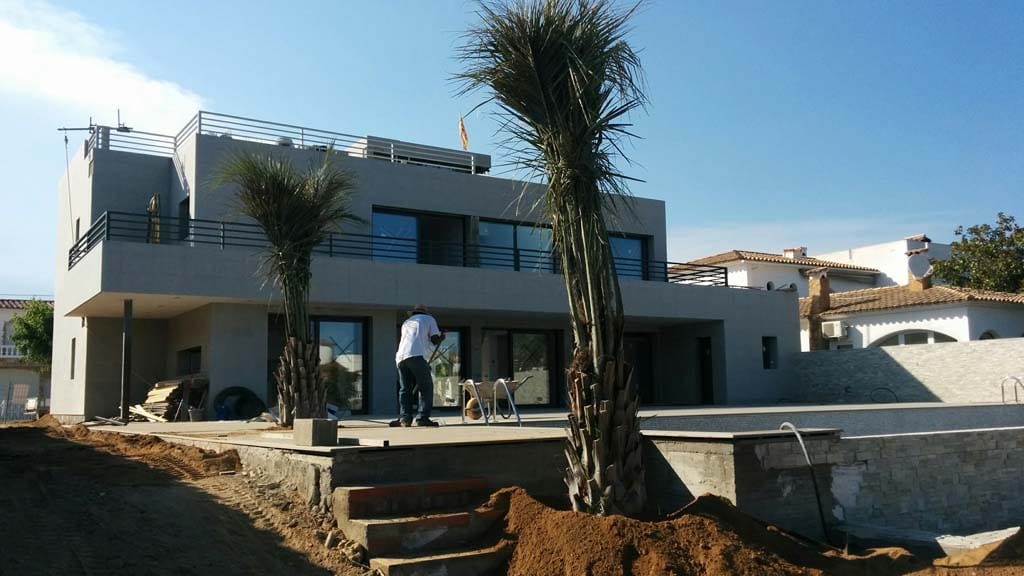 Jardí amb gespa natural en rotlles, palmeres per a destacar la piscina desbordant, on la senzillesa de les plantes i materials utilitzats donen al jardí l’elegància adequada a aquesta casa d’estil contenporani.