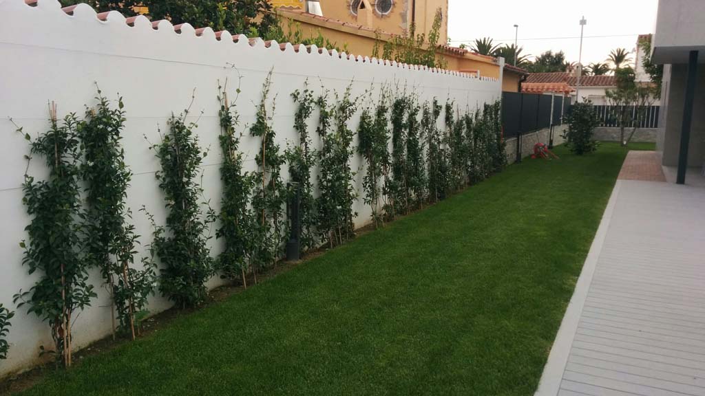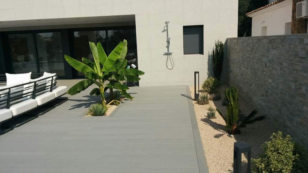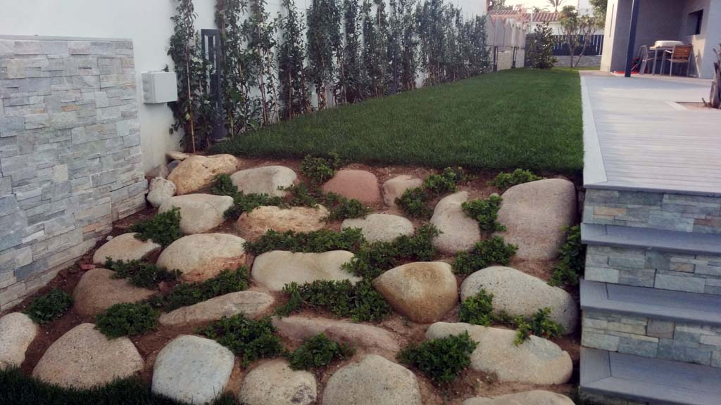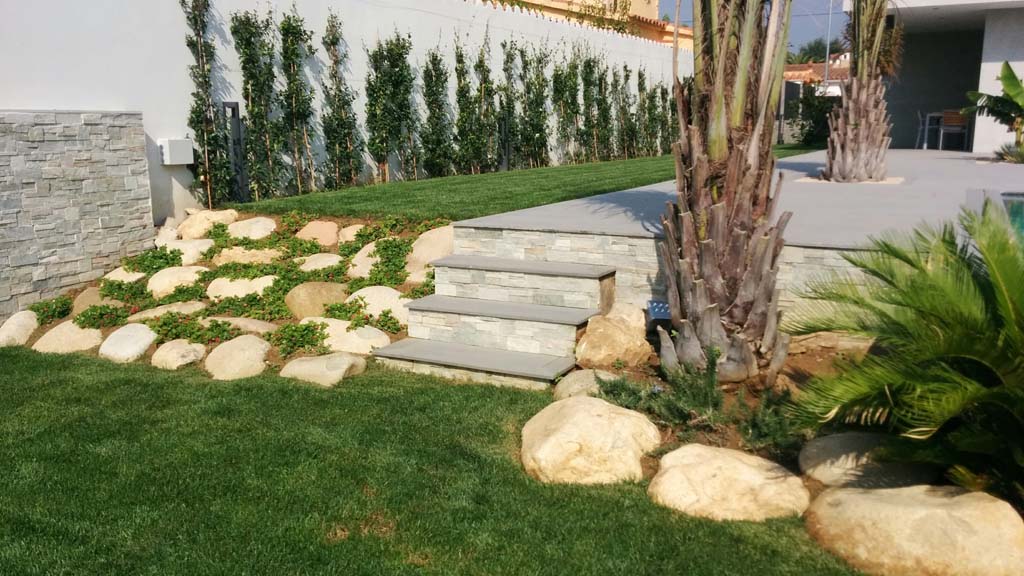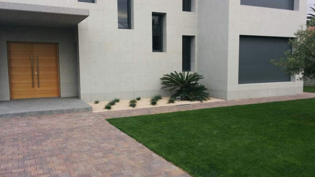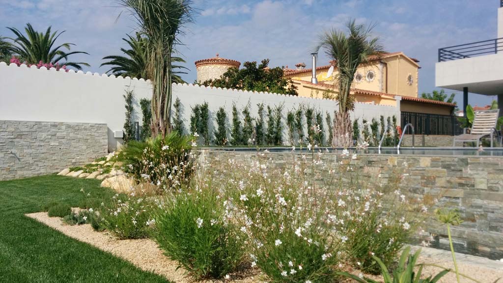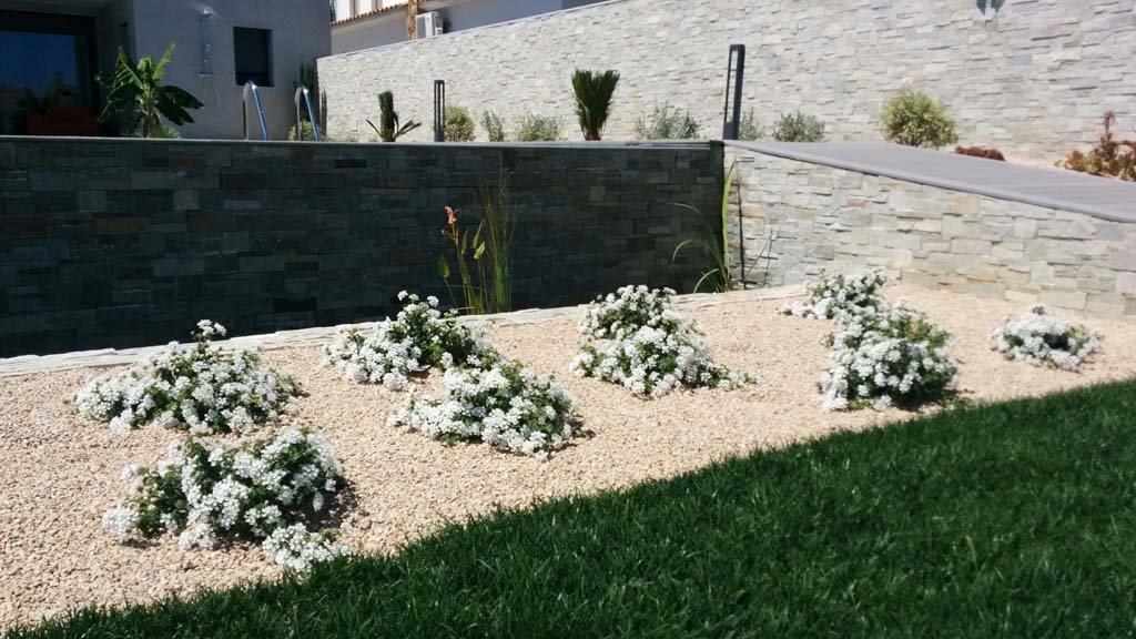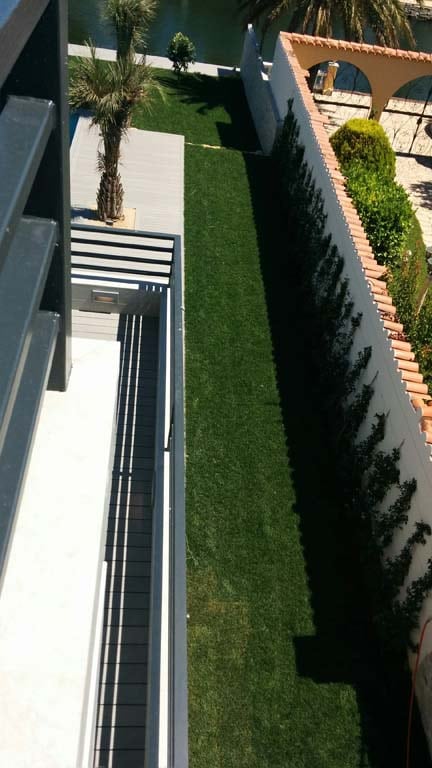 Jardí amb gespa natural en rotlles, palmeres per a destacar la piscina desbordant, on la senzillesa de les plantes i materials utilitzats donen al jardí l’elegància adequada a aquesta casa d’estil contenporani.