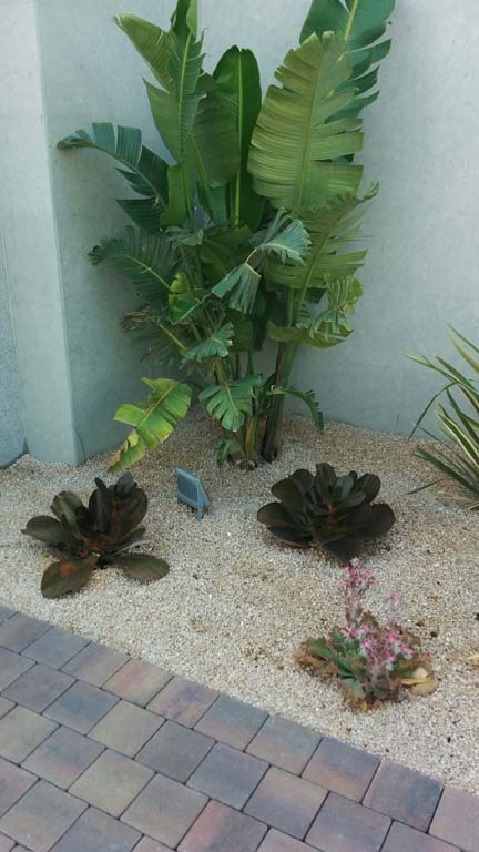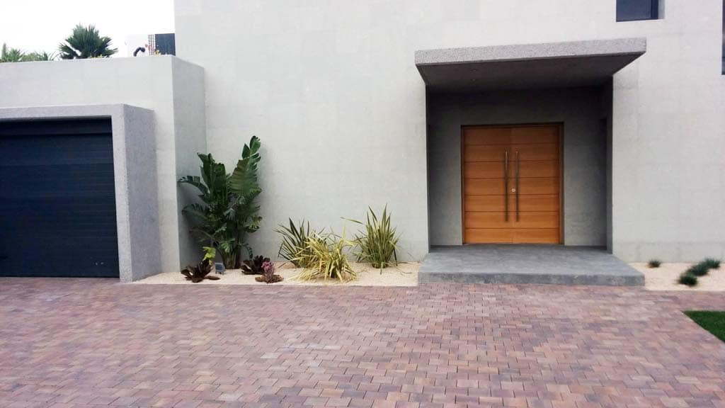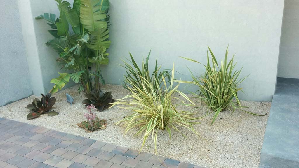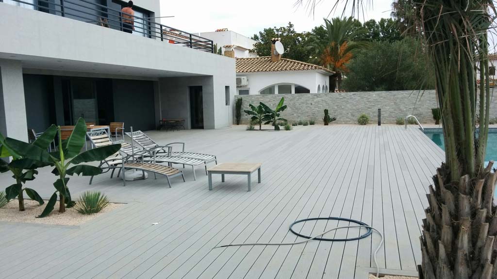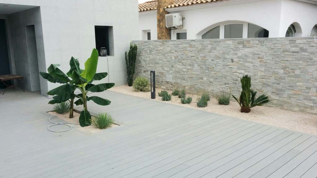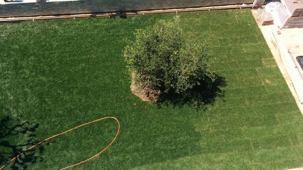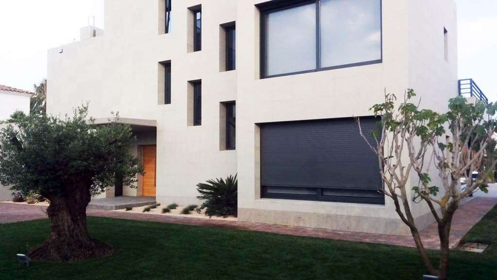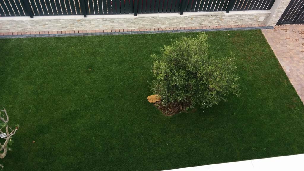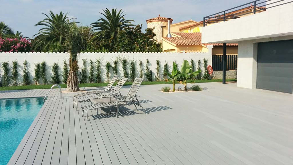 Jardí amb gespa natural en rotlles, palmeres per a destacar la piscina desbordant, on la senzillesa de les plantes i materials utilitzats donen al jardí l’elegància adequada a aquesta casa d’estil contenporani.